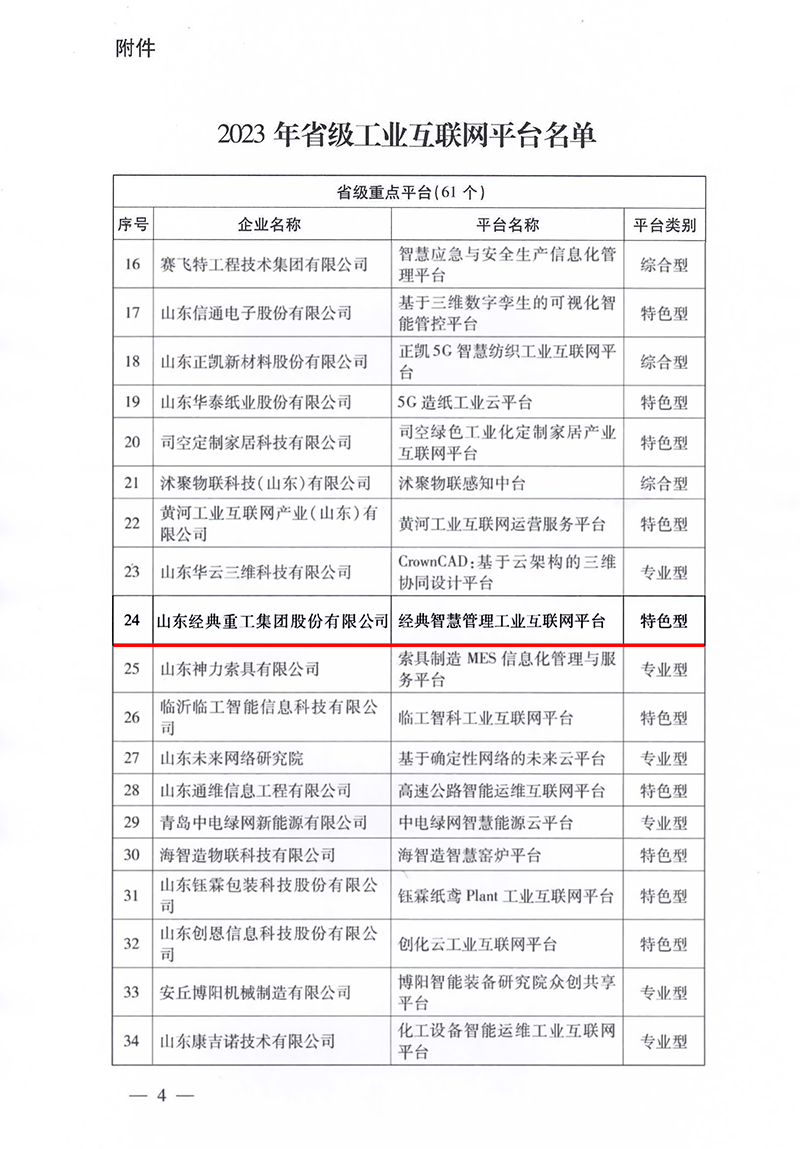 近日,山東省工業(yè)和信息化廳發(fā)布了《2023年省級(jí)工業(yè)互聯(lián)網(wǎng)平臺(tái)名單》,山東經(jīng)典重工集團(tuán)股份有限公司“經(jīng)典智慧管理工業(yè)互聯(lián)網(wǎng)平臺(tái)”成功入選山東省級(jí)工業(yè)互聯(lián)網(wǎng)重點(diǎn)平臺(tái)名單。