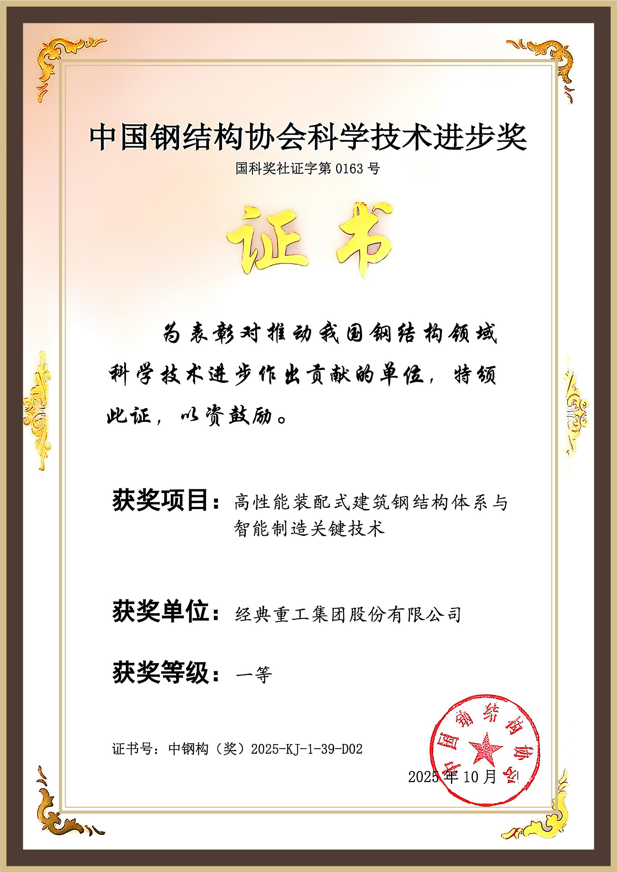 在科學技術獎頒獎典禮上,經典重工集團股份有限公司作為主要科研單位參與的《高性能裝配式建筑鋼結構體系與智能制造關鍵技術》項目榮獲中國鋼結構協(xié)會科學技術進步獎一等獎。